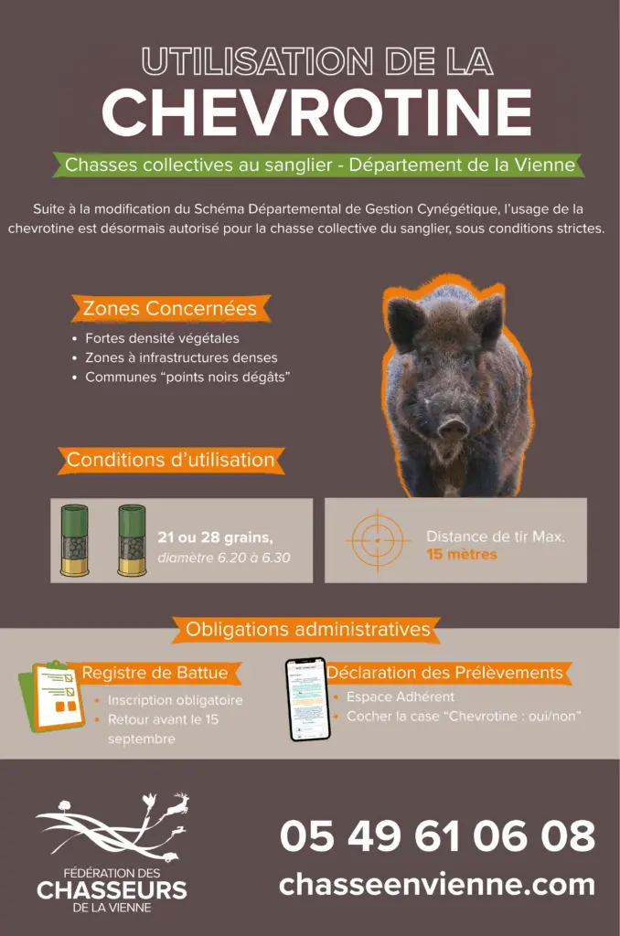 Suite à l’évolution du Schéma Départemental de Gestion Cynégétique, l’usage de la chevrotine est désormais autorisé lors des chasses collectives au sanglier dans le département de la Vienne, sous conditions strictes.